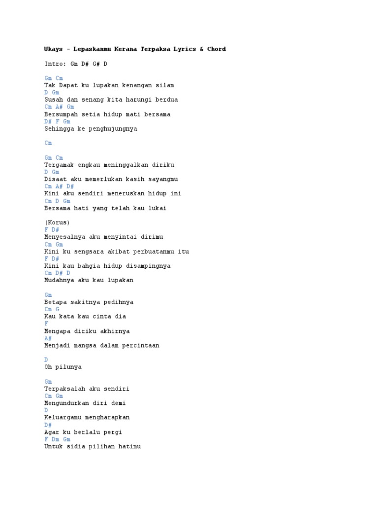 Lepaskanmu Kerana Terpaksa Chord - G c melepaskanmu c bukan mudah bagiku em untuk melalui semua ini em pabila kenangan kita f mengusik jiwa dan hati f kala malam tidur ku tak lena g mengenangkanmu.
