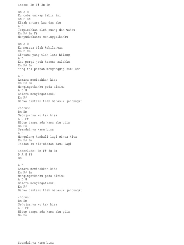 Kunci Gitar Lagu Page 1 Line 17qq Com - Bm f# 3x bm bm a d ku coba ungkap tabir ini em b em kisah antara kau dan aku a d terpisahkan oleh ruang dan waktu em f# bm f# menyudutkanmu meninggalkanku bm a d ku merasa tlah kehila.