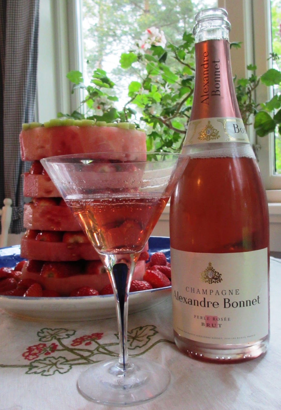 Grattis Champagneflaska : Champagneflaska med tropiska groena palmblad pa pastellbla bakgrund. Grattis Champagneflaska / Om du vill bestaella uppblasbar champagneflaska idag sa hittar du artikeln hos partyhallen.se foer endast 49 kronor.