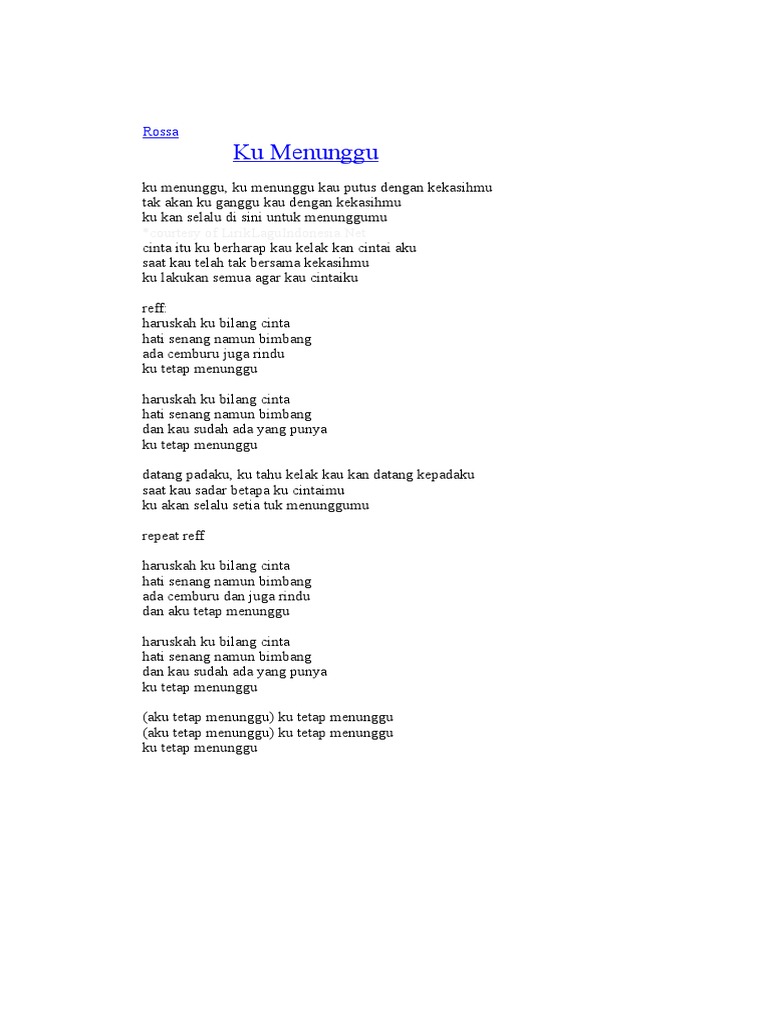Lirik Lagu - Ku menunggu, ku menunggu kau putus dengan kekasihmu tak akan ku ganggu kau dengan kekasihmu ku kan selalu di sini untuk menunggumu.