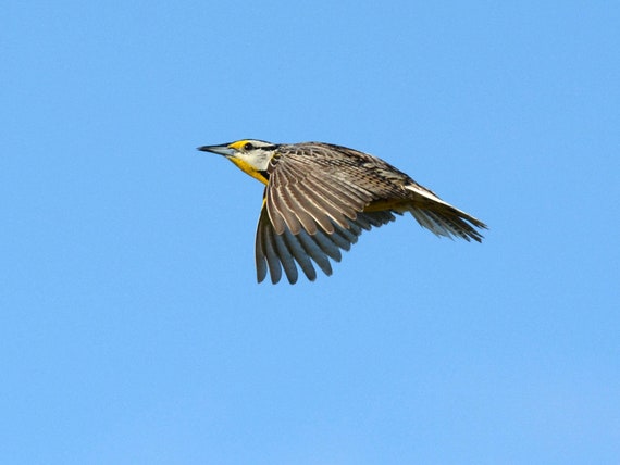 Western Meadowlark Flying / Western meadowlark perches, sings, flies. Western Meadowlark Flying : In spring and summer, males sing out from atop fence posts, bushes.